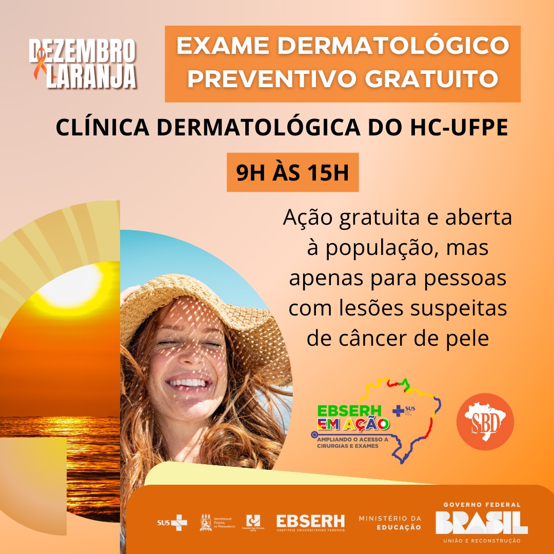 Em apoio à campanha nacional Dezembro Laranja, promovida pela Sociedade Brasileira de Dermatologia, e como parte da iniciativa “Ebserh em Ação”, o Hospital das Clínicas da UFPE, vinculado à Empresa Brasileira de Serviços Hospitalares (Ebserh), realizará exames de prevenção ao câncer de pele neste sábado (7). O atendimento, que acontecerá na Clínica Dermatológica do HC, das 9h às 15h, é gratuito e aberto à população, mas apenas para pessoas com lesões suspeitas de câncer de pele, que farão exames dermatológicos preventivos gratuitos e receberão orientações. Não é necessária inscrição prévia para participar. O número de atendimentos será limitado à capacidade da equipe e do horário do evento.