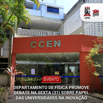 O Departamento de Física da UFPE promove, nesta sexta-feira (31), às 16h, colóquio sobre o papel das universidades na inovação com o pró-reitor de Pesquisa e Inovação Pedro Carelli. O evento é aberto ao público e ocorre no Auditório do Departamento de Física, localizado no Centro de Ciências Exatas e da Natureza (CCEN), no Campus Recife.